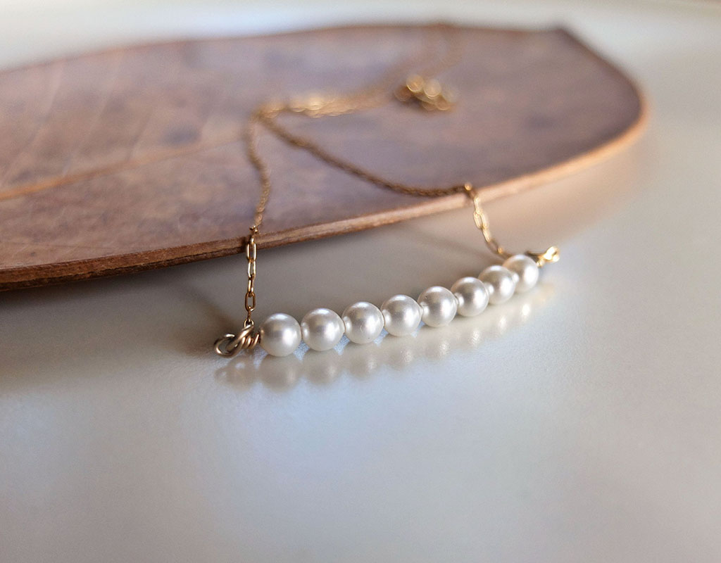 Goldfilled chain necklace with small Swarovski pearls beaded bar. Pearls are 4 mm diameter.