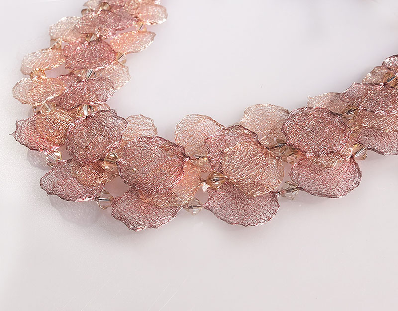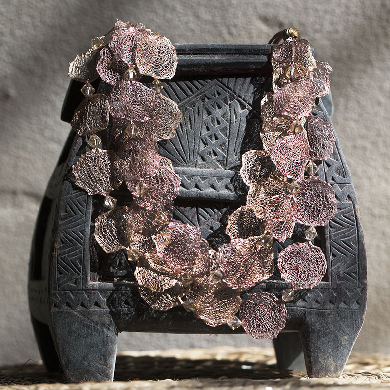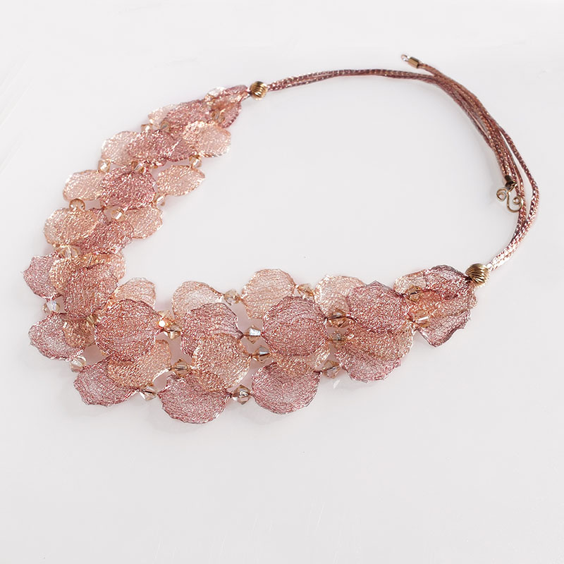 This original necklace made of delicate metal mesh (wire lace). The threads are enamel coated and hypoallergenic. The necklace is soft, as fabric, but keeps clean for many months and does not require special care. The enamel coating is very durable and does not change color over time
