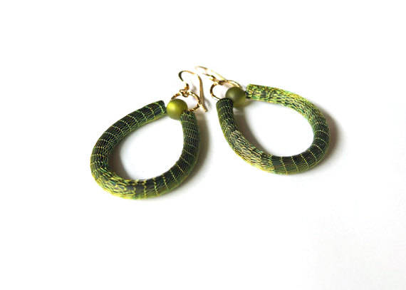 Large hoop green earrings, made of the delicate metal mesh (wire lace) with gold filled findings.