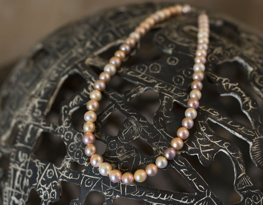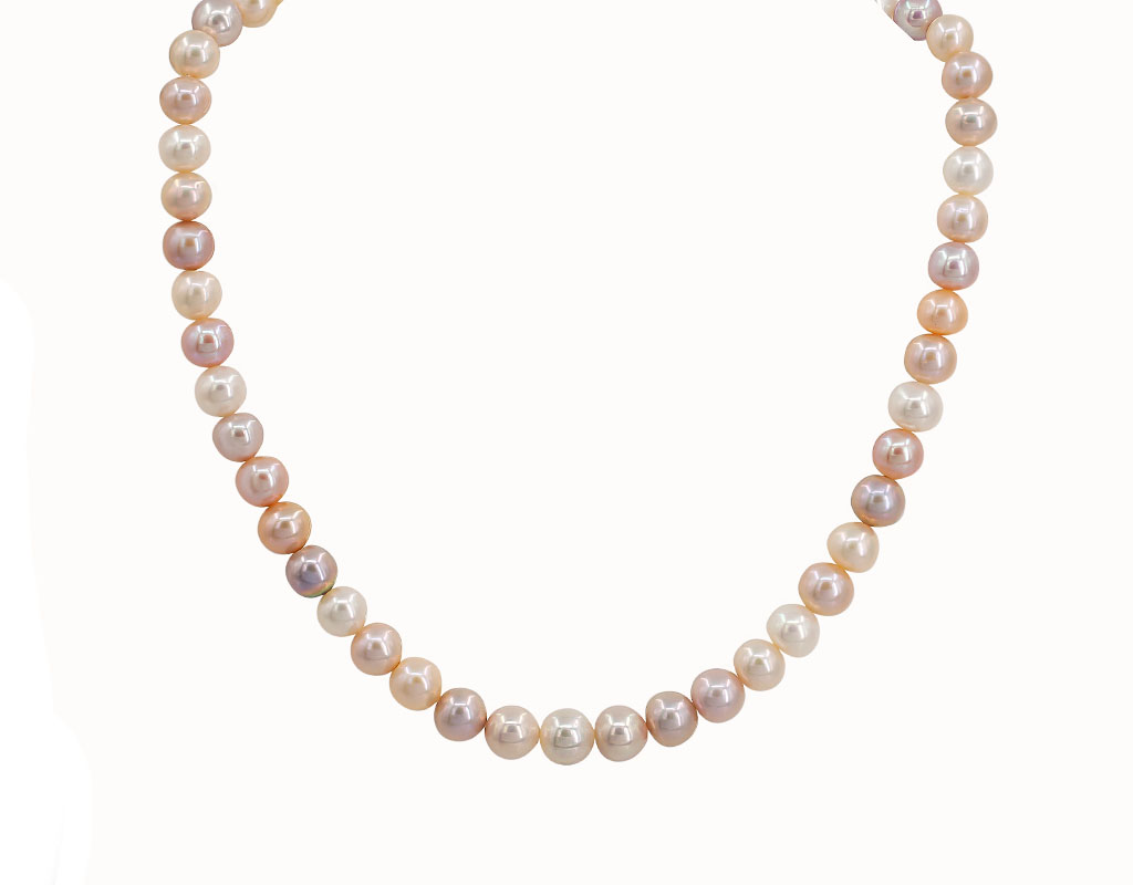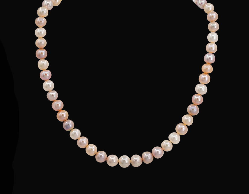 Big freshwater pearls in gentle pastel colors: off-white, peach, yellowish, light lilac.