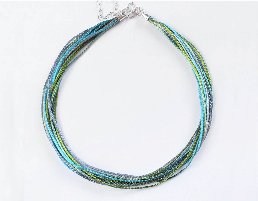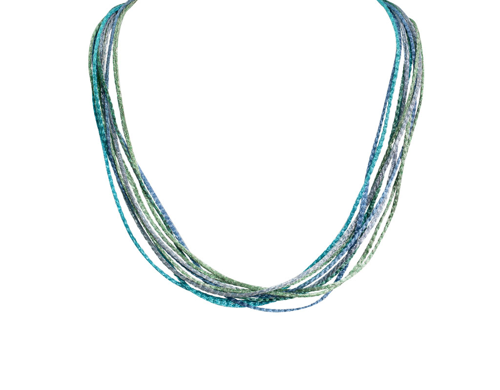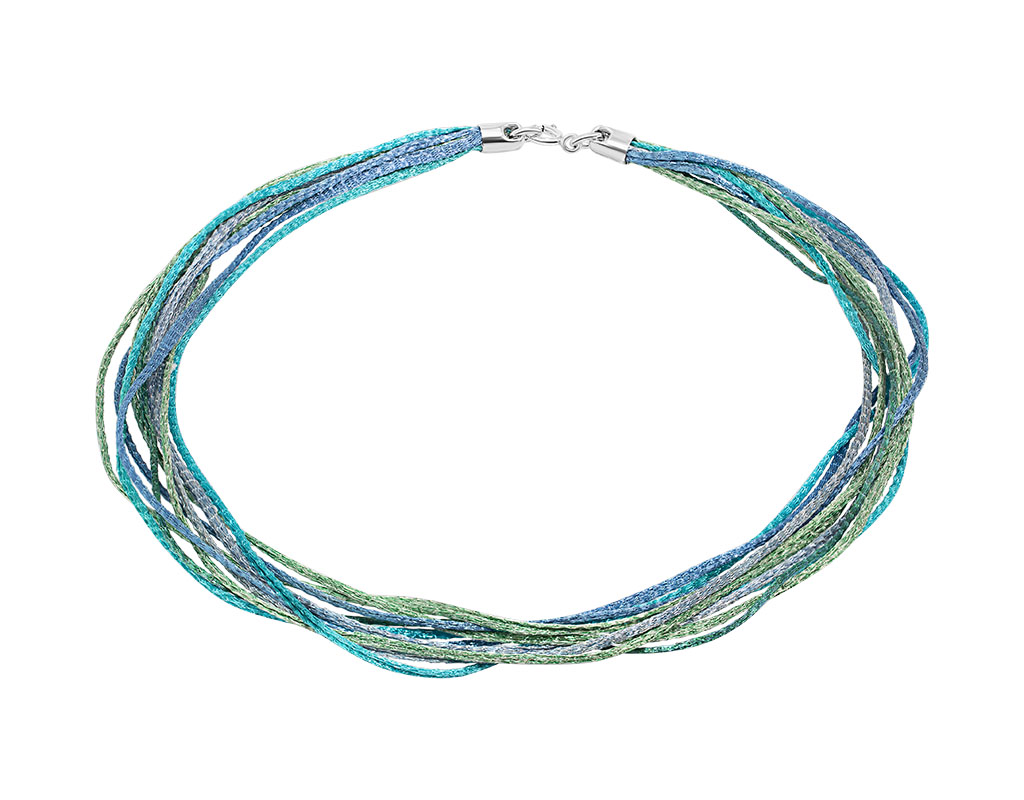 Necklace made of delicate metal mesh woven cords (wire lace). The threads are enamel coated and hypoallergenic.The necklace is soft, as fabric, but keeps clean for many months and does not require special care.The enamel coating is very durable and does not change color over time